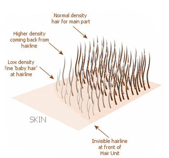 The transitional density hairline beautifully imitates the natural progression of real hair growth. Mimicking the authentic appearance of growing hair, the initial few millimeters of our lace units feature a lighter density, seamlessly merging into a more standard density. Furthermore, the hair at the front is finer, mirroring the characteristics of a real hairline. Each individual hair strand is intricately attached to our special lace material in such a unique manner that it becomes virtually impossible to discern the attachment points. Once adhered to the scalp with bonding adhesive, the lace becomes exceptionally inconspicuous. The outcome is a front hairline that exudes a remarkably natural and nearly undetectable appearance.