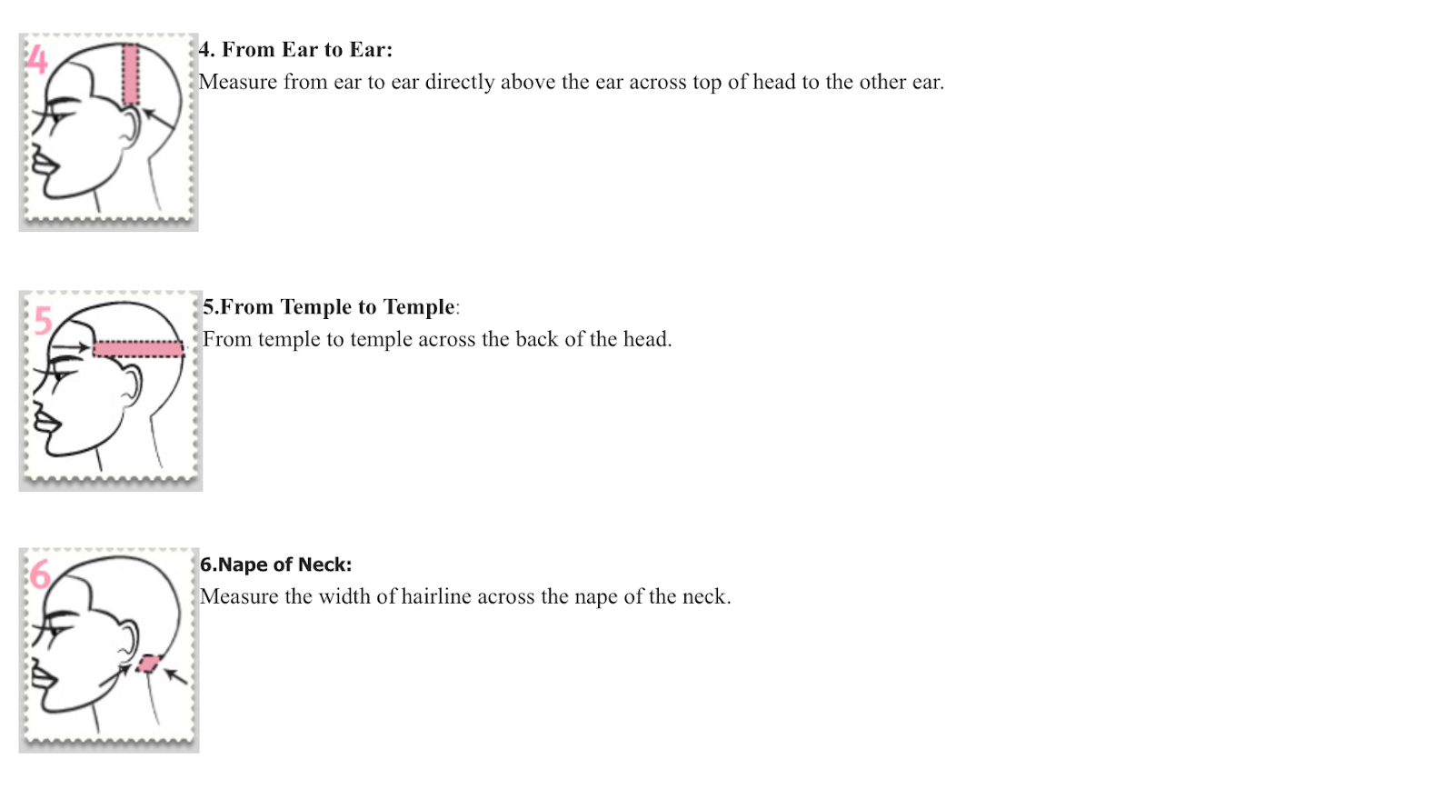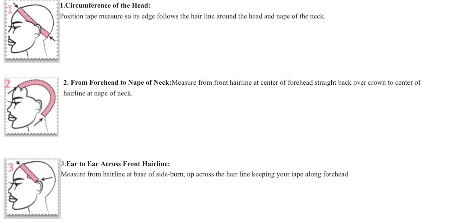 Before you begin measuring your head, make sure your hair is all pinned up and lying flat (with or without a wig cap). Your hair must be prepared the same way you would have it right before applying the wig. This will eliminate bulges that distort head contours. Use a tape measure to measure. Most lace wig measurements are made in inches. Do not stretch the tape measure tape when measuring. * When measuring, place your measuring tape outside of your natural hairline.